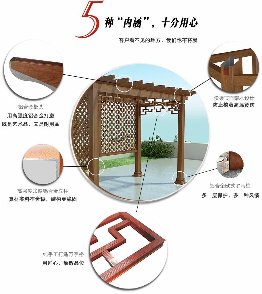 铝合金结构性能优越,不开裂、不变形、不生锈、不褪色、防虫蛀,无需刻意维护便可长久使用